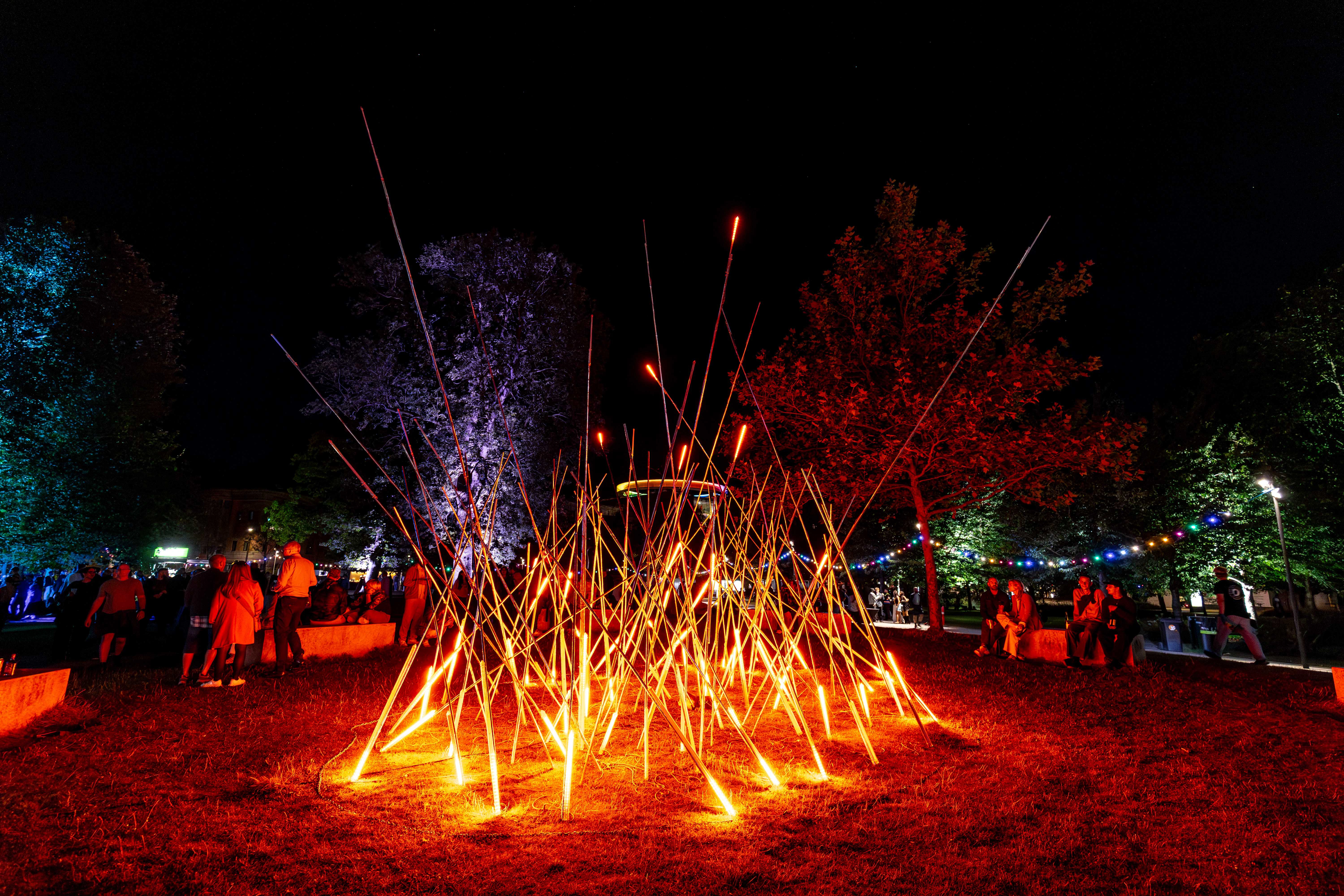 Midt i Mølleparkens mørke rejser lysværket ’Fluxit’ sig som et glødende og gnistrende bål og et lysende symbol på overgangen fra fortid til fremtid.
