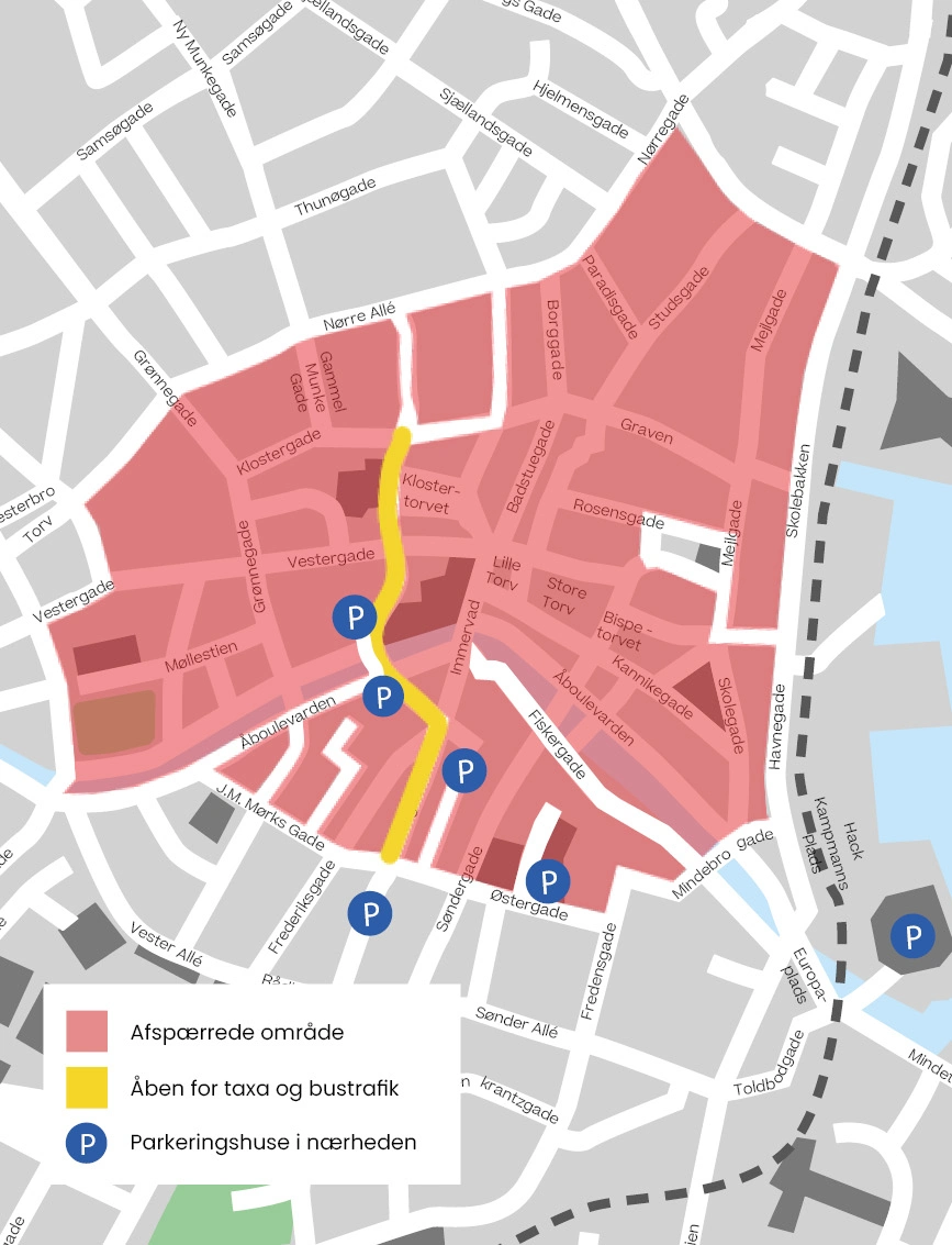 Afspærringerne gælder fra formiddag til aften og er etableret for at give plads til arrangementer, scener, aktiviteter og de mange gæster, der samles i byens gader. Se vedlagte kort for nærmere information om afspærringer.